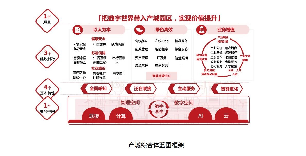 智慧園區(qū)藍(lán)圖框架,應(yīng)用于指導(dǎo)產(chǎn)城綜合體園區(qū)的智慧化規(guī)劃與建設(shè)。
