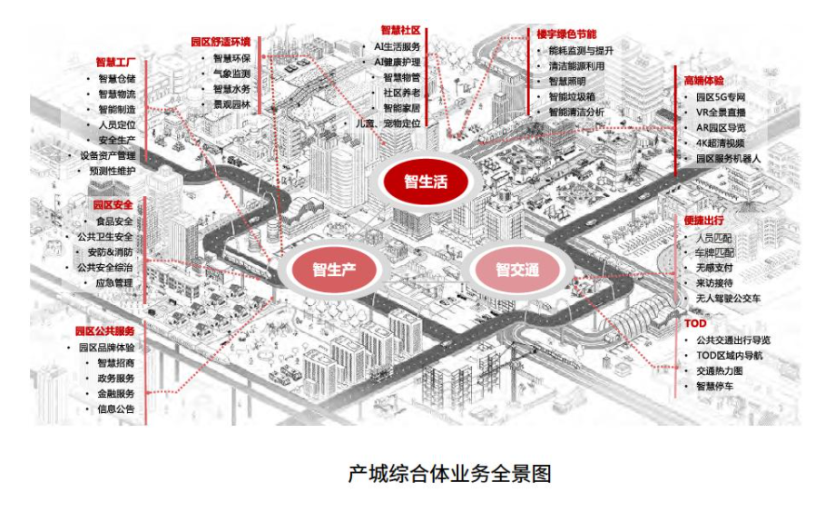 基于藍(lán)圖框架,圍繞產(chǎn)城綜合體中社區(qū)、工廠、樓宇、交通、環(huán)境、安全和公共服務(wù)等場景,可以全面勾勒出未來產(chǎn)城綜合體的全景圖(如圖所示)。