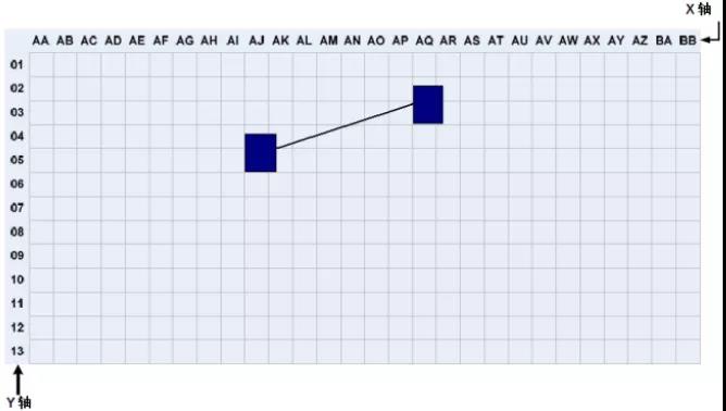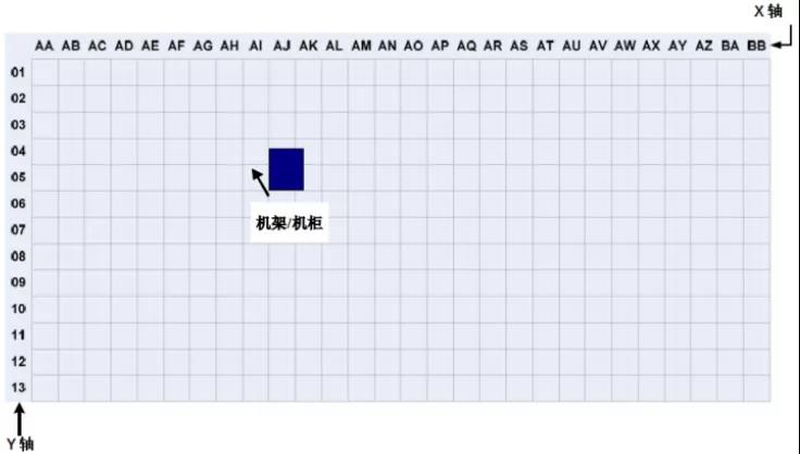 在數(shù)據(jù)中心,機(jī)柜和機(jī)架的位置和布局可以根據(jù)活動(dòng)地板的劃分進(jìn)行組織和標(biāo)記。根據(jù)ANSI/TIA/EIA-606-A標(biāo)準(zhǔn),數(shù)據(jù)室應(yīng)使用兩個(gè)或兩個(gè)字母,每個(gè)600mm*600mm活動(dòng)地板用阿拉伯?dāng)?shù)字標(biāo)識。在數(shù)據(jù)中心機(jī)房平面圖上建立X、Y坐標(biāo)系的網(wǎng)格,用字母標(biāo)記X軸,用數(shù)字標(biāo)記Y軸,建立坐標(biāo)原點(diǎn)。機(jī)架和機(jī)柜的位置基于它們在網(wǎng)格地圖上的正面坐標(biāo)。標(biāo)注如下圖 2所示